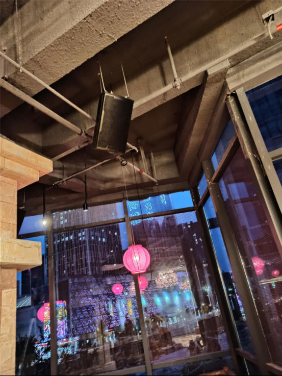 餐吧内还垂直或水平吊挂安装了8只AT-10补声音箱,用于对固定点位进行补声,弥补高频衰减。可使餐吧内的声压级更加均匀,达到声音萦绕全场的效果,更让宾客在音乐的熏陶下舒缓身心。