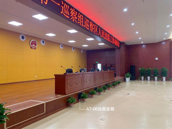 根据审判庭整体设计,以“QX-215主扩音箱+QX-118超低音箱”分别落地叠放于舞台两侧,并利用处理器对它们进行延时耦合,低音声能叠加3dB,营造起良好的声场。