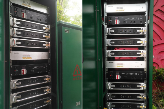 系统传输方式上,考虑现场传输距离大,为了减少长距离带来的声衰减,所以采用Dante传输,由总核心控制机柜上的核心交换机进行管理传输全部的音频信号,并配置了一台SC-802电源时序器控制电源开关。