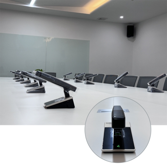 在发言系统方面,配置的是一套强大的数字会议系统,由无线、有线共用的双模数字会议主机G-T40、无线主席单元G-T40C和12台无线客席单元G-T40D组成,支持无线和有线两种连接方式,能够满足不同类型的发言需求。此外,还准备了一套URT-42无线手持话筒,方便会上人员随时进行流动演讲。