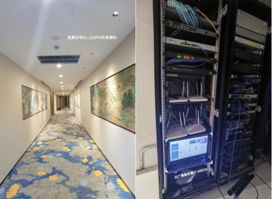 IP网络广播系统需满足楼内背景音乐播放、消防应急播报、高效分控管理等需求。为此,超凡国际 设置了一套IP-8000云网络广播系统,由云广播服务器IP-8002A、管理软件IP-8000Y、网络功放IP-8240N、CL-122FH天花喇叭及AW-830音柱等设备组成。