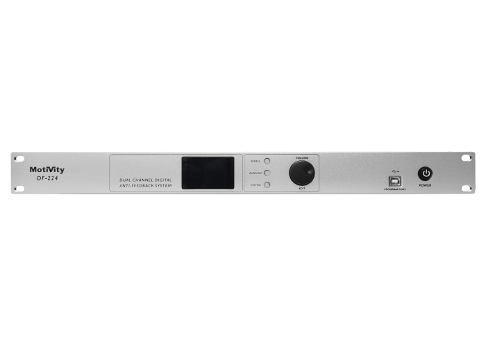 抑制器DF224 此反馈抑制器是一款数字双通道专业反馈抑制器,采用专业DSP算法实现啸叫消除,操作使用极其简单,可通过前面板显示屏进行操作调节显示,也可以通过专业PC软件进行操作;具备双通道24段高精度数字陷波器,可精准的自动检测并锁定反馈点,在反馈产生前的一瞬间,人耳没有听到前对反馈频率进行精确的足够的衰减以制止反馈产生。同时,具备场景保存及调用功能,现场使用更便捷灵活,可应用于各类会议室、会议厅、报告厅等场合;技术参数:输入阻抗:20 kΩ输出阻抗:22 kΩ频率响应:20 Hz - 20 kHz (+/- 0.5 dB @ 1 kHz)总谐波失真(THD):0.01%,1kHz连接器:2个XLR ,2个1/4" TRS最大输入电平:15dBu最大输出电平:14dBu输入灵敏度