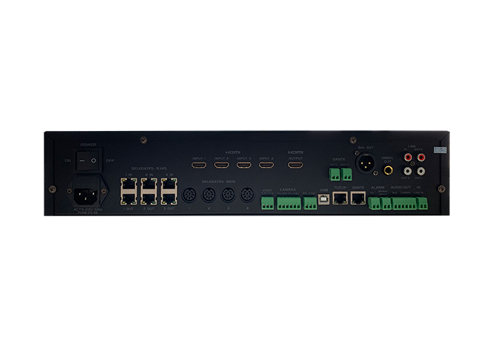 具有警报信号输入接口(警报电压接口+1路2P凤凰插警报音频输入口),当公共广播警报系统启动时,可自动暂停会议,并向与会单元发送警报信息