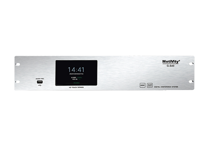 技术特点:集会议讨论、摄像跟踪、电子签到、投票、表决功能于一体采用全数字会议技术,基于数字网络架构开发,内置高性能CPU处理器,处理速度更快,音质更佳,支持讨论、视像跟踪功能 高性能开关电源供电,长距离传输对音质不会有任何影响抗干扰电路设计,杜绝一切手机信号的干扰采用5寸全视角IPS电容触摸屏,直观显示和方便调节系统的各项参数支持USB录音,高保真WAV格式输出具有4路8芯话筒单元接口,每路支持30个单元,可接120个单元单台主机通过扩展电源最多可接256台会议单元,亦可通过会议扩展主机(多个扩展主机之间手拉手串联连接),一套会议系统最多可接入达1200台会议单元;单元采用“手拉手”连接方式,支持热插拔,方便安装和维护具有多种会议模式: FIFO(先进先出模式)、APPLY(申请模式)、FREE(自由模式)、L